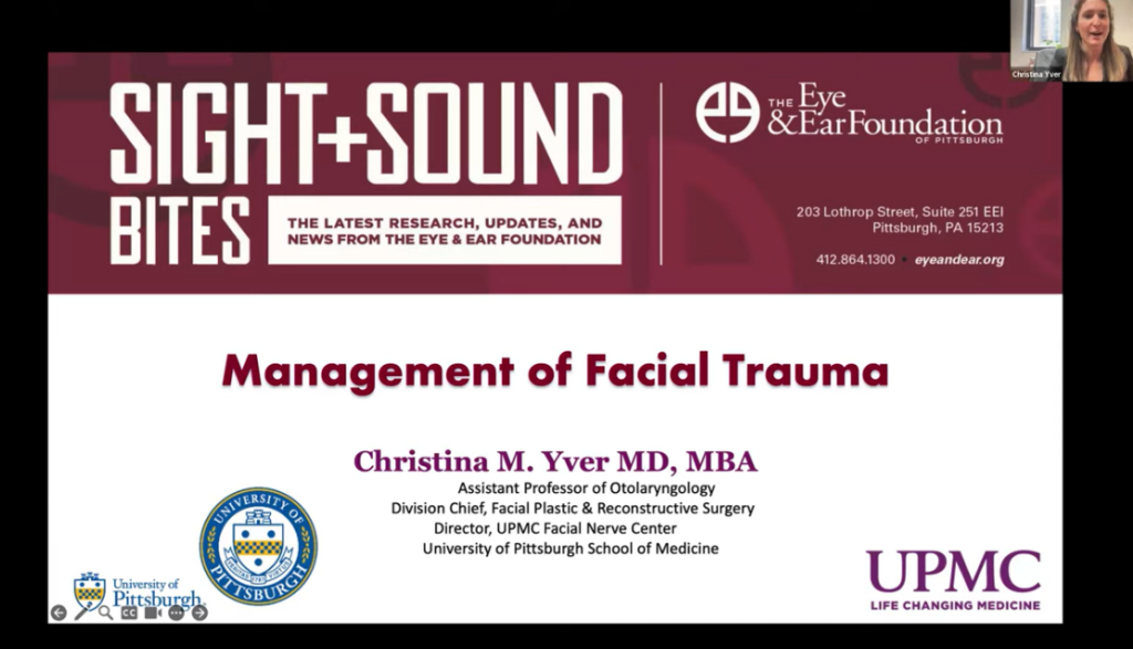 “Management of Facial Trauma,” the Eye & Ear Foundation’s February 27th webinar, is a topic that makes up a large part of Christina M. Yver’s practice. The Division Chief of Facial Plastic & Reconstructive Surgery and Director of the UPMC Facial Nerve Center said it is a very satisfying aspect of her practice that keeps her busy and on her toes. “I think it’s relevant to a lot of patients,” she added.